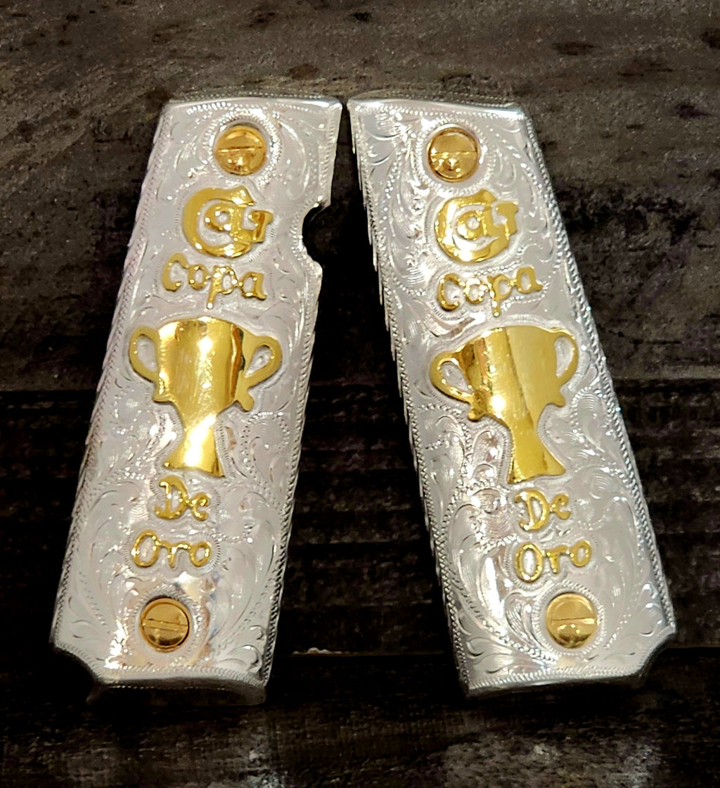 Custom order colt 1911, beretta 92fs, 92S, 92A1 Mexican style gold plated grips orden especial cachas Mexicanas chapa de oro